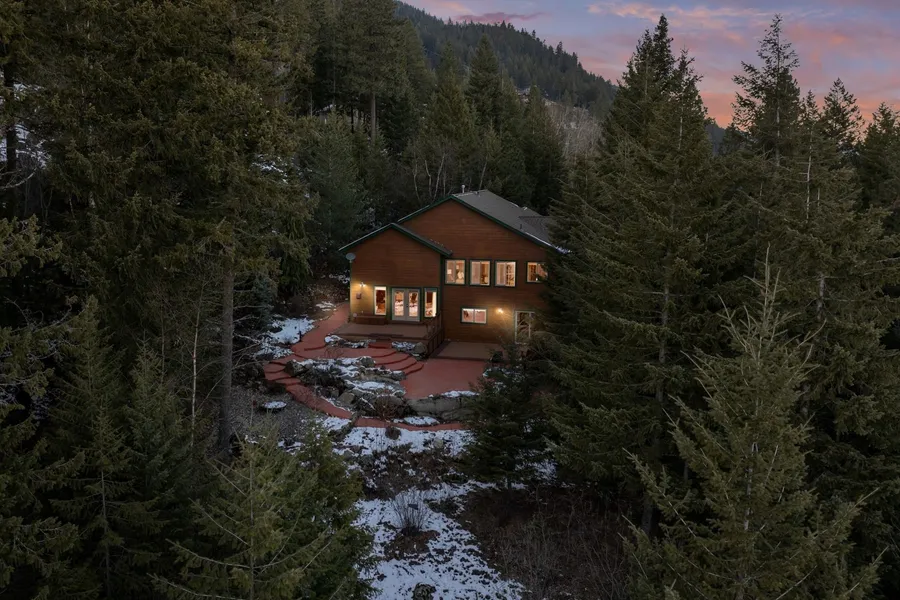 Tucked into the hillside, this warm and inviting home feels like a true retreat, offering a peaceful forest setting with stunning lake and mountain views. Stone accents and terraced walkways blend beautifully with the natural surroundings, while multiple outdoor spaces provide the perfect spot to relax and take in the scenery. Thoughtfully designed with expert craftsmanship, the home features custom cherry, maple, and birch cabinetry, built-ins, and expansive windows that capture the breathtaking landscape. The well-appointed kitchen and dining area open to the terraced backyard, while the living room on a separate level leads to the spacious deck—both outdoor spaces seamlessly connected for effortless entertaining. The private primary suite offers a walk-in closet and en-suite bath with a soaking tub and separate shower. A unique four-car garage—two bays deep—provides extra parking, storage, or workshop space. Located just outside Sandpoint city limits, this home offers privacy while remaining close to town, with quick access to the Schweitzer Ski Shuttle. Ideal as a full-time residence, year-round getaway, or short-term vacation rental.