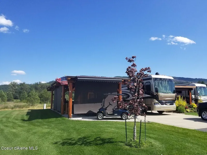 Very private corner lot with unobstructed mountain views. New and modern cabin has a full-size refrigerator, stainless steel utility sink, bathroom with toilet, sink/ shower, and instant hot water heater. Tastefully finished with blue pine paneling. The log pergola has been custom built and has ceiling fans, French drains, space heaters, and upgraded 200 amp power. Also included is a custom built-in bar with stools. This property is adjacent to the large dog park and owner's recreational lodge that has many amenities. The owner's lodge has an outdoor pool, hot tub, kitchen, great room, laundry facilities, bathrooms with showers, and a workout room. Stoneridge has an amazing 19 hole golf course, pickleball courts, and outdoor trails for walking and biking.