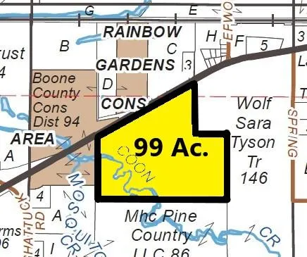 $5,000 per acres. 57 acres of productive farm ground and 42 acres of wooded recreation land that Coon Creek flows through. Maintained trails and camping area on the bank of Coon Creek. Parcel is adjacent to Boone County Conservation District. Partial flood plain. Class B soils, level terrain. 127.5 Productivity Index Rating. Soil types: Marshan, Jasper, Comfrey, Lahoguess, Flagler, Warsaw and Drummer. 2020 taxes $2,051. PINs#: 06-33-300-007, 06-33-400-001, 06-33-100-011 and part of 06-33-276-005. Home on 5.6 acres located on the north side of Hwy 20 is also available at $224,900