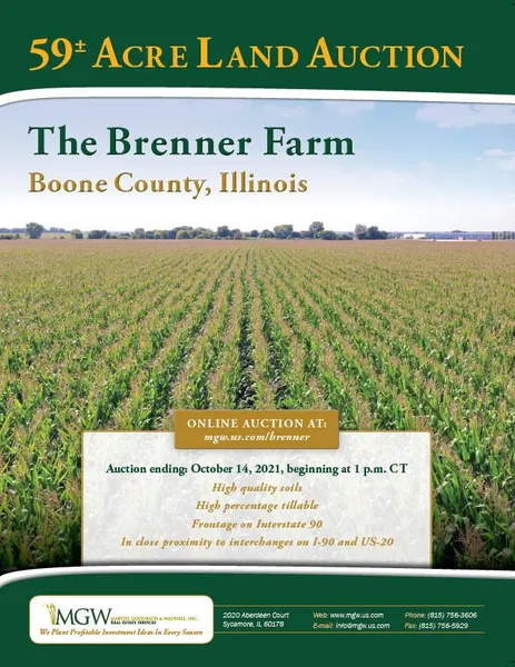 Legal Description: A brief legal description indicates The Brenner Farm is located in Part of the Southeast Quarter of Section 3, Township 43 North Range 3 East (Belvidere Township), Boone County, Illinois.