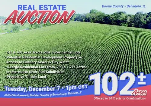 Tract 1: 51 ac A mix of non-tilled & tillable land w/ some woods, accessed by River Run Pkwy which stubs to the E side of the property. Property is mostly zoned SR3/Single Family Residential/3 District & there is a small amount that is zoned SR4/Single Family Residential/4 District on the W side. Sanitary Sewer & city water is available w/ lines running through the property. Auction Company has been advised by the Belvidere Community Development Planning Department that this property was part of a larger parcel that had a preliminary plat approved on February 2, 2004. Tract 1 is w/in the Belvidere Community Unit School District 100.