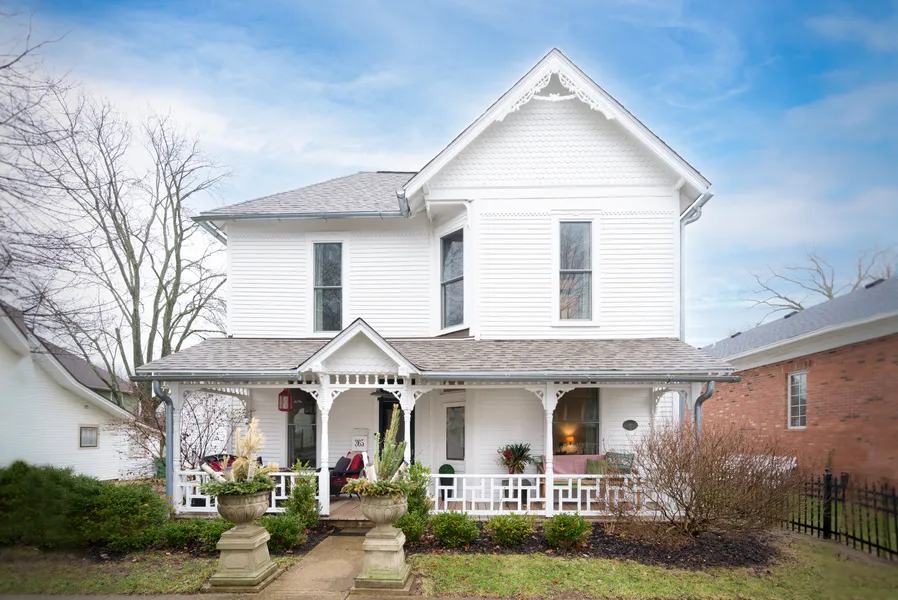 A remarkably unique home in the heart of Downtown Zionsville's historic district. Think crown molding, original 1900s built-ins, hardwood floors, tall ceilings, mixed with numerous updates. Relax on the ultra large covered front porch. Enter into a spacious living room and adjacent sitting room. The wood burning stove keeps it nice and cozy. The main floor's primary suite includes a very large, newly remodeled bath with soaking tub, and walk in tiled shower. The large formal dining room connects to the renovated farmhouse kitchen --with its tile floor, granite countertops and top-of-the-line Viking gas range. The basement is plumbed for an additional bathroom. The top floor has three creative bedrooms that share a fun Jack & Jill style bathroom. One of the bedrooms even has a private entrance from the backyard patio. Speaking of the backyard, this home boasts numerous outdoor areas. Whether you choose to sit in the brick laid courtyard behind the privacy vines or entertain friends & family from the large outdoor living area, there's space for all. Plus, the garage barn can house 3 cars, and has a palatial unfinished second story loft creating limitless carriage house possibilities! Steps from Village shops, restaurants, library, schools, parks and more.