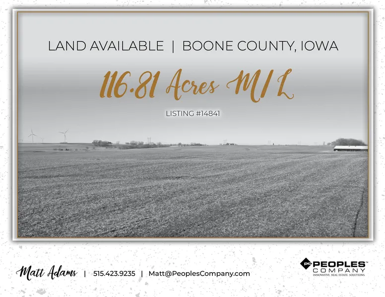 Here is your opportunity to own Boone County, Iowa farmland! The property consists of 116.81 acres m/l with 114.54 tillable / farmland acres with a CSR2 rating of 81.5. Primary soil types include high-producing Clarion loam and Webster clay loam. There are drainage intakes located on the farm but the amount and size of drainage tile is unknown. Conservation measures have been actively applied with well-maintained waterways designed to preserve topsoil from moving water. In addition, there are 2.63 acres enrolled in the Conservation Reserve Program (CRP) through September of 2027 with an annual payment of $994 or $378 per acre. The CRP practice these acres are enrolled in is the Grassed Waterway or CP8A program.