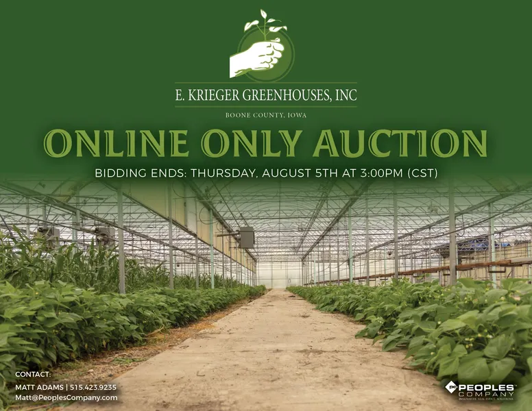 Offering an industrial greenhouse complex owned by E Krieger Land LLC in Boone, Iowa through an ONLINE ONLY auction where all bidding must be done online through Peoples Company's bidding application. Bidding is currently LIVE and will remain open until Thursday, August 5th, 2020 at 3:00 PM Central Time Zone (CST) with closing taking place on or before Thursday, October 7th, 2021. A bid placed within 3 minutes of the scheduled close of the auction will extend bidding by 3 minutes until all the bidding is completed. If you plan to bid, please register 24 hours prior to close of auction. Under no circumstances shall Bidder have any kind of claim against Peoples Company or its affiliates if the Internet service fails to work correctly before or during the auction.