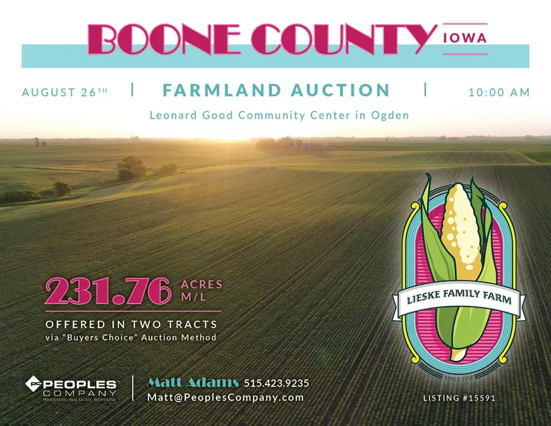 Research Parcel InformationFrom Ogden, Iowa: Travel south out of town on State Highway 169 for 4.5 miles and turn right (west) onto 270th Avenue. Continue for approximately 2 miles and the farm will be located southeast of the intersection of 270th Street and F Avenue. Look for the Peoples Company sign.