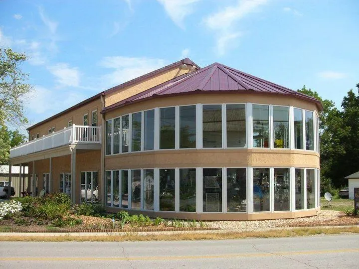 Steel structured unique building featuring many windows. Two story glass front facing main road. Lower level is retail area. Second floor has a 1309 sq. ft two bedroom, 1 bath apartment, third floor has a storage area. Two stairways to upper floor. Private deck off apartment. This structure is very versatile and great for a new business. Located in the center of Hallsville business district. City of Hallsville zoning is Business rather than Commercial. Chandelier in the lower level does not convey.