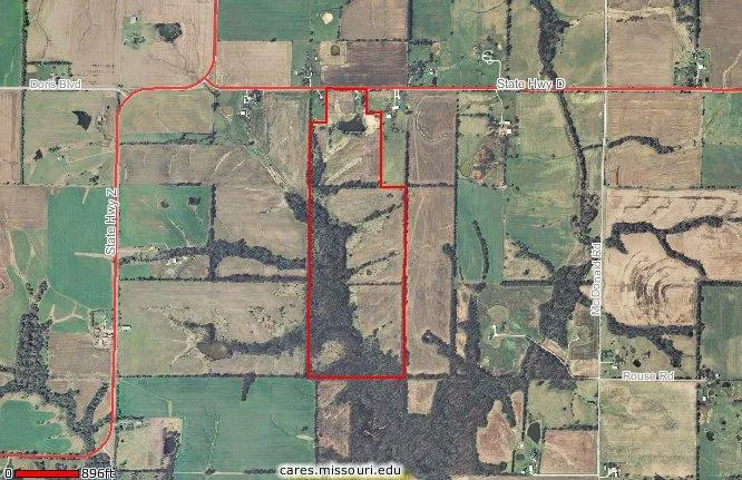 108 acres located on Hwy D north of Columbia. 65 acres tillable currently in beans for 2010 and 43 acres woods and scattered trees. Mobile home pad on property. Blacktop frontage and public water. Asking $2550/acre.