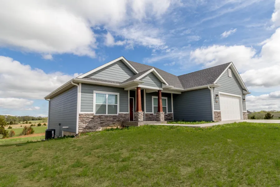 Don't miss your chance to see this beautiful new construction home that sits on 10 acres! Smart layout makes this home very functional. Split bedroom design gives the master suite privacy! Master bedroom looks out at vast backyard views. Spa-like master bath includes stand-alone custom tiled shower with glass door, jetted tub, dual sinks and walk-thru master closet that connects to the laundry room. Laundry room has custom cabinets for ideal storage. Living area is open to kitchen, formal dining & eat-in kitchen area ideal for entertaining. Living room boasts tall ceilings & fireplace. Step onto the covered deck and enjoy the views! Lower level is ready to be finished. Property is close to highway ideal for commuting.