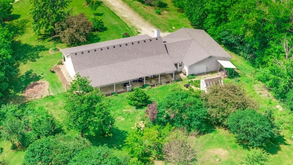 Charming brick ranch on nearly 5 acres of lush landscaping! Covered porch w/burning bushes, fruit trees (pear, cherry peach) roses, hydrangea, tulips, lilies,raised garden beds, butterfly garden.,serene pond w/fountain. & greenhouse has w/power. ADA accessible, main-level living, on a slab. Home has wood floors, an open floor plan, & a cathedral ceiling in the great room w/a cozy brick WB fireplace & built-ins. A spacious kitchen boasts ceramic tile, breakfast bar, generous cabinets, & appliances that convey. Huge primary suite w/walk-in closet & access to back patio. Spa-like bath features a jetted tub, shower, & double vanities. Garage w/drive-through door perfect for shop or 4 cars is plumbed for sink & toilet. New roof end of 2024. Enjoy privacy & nature in this gardener's delight. Another highlight is the breezeway converted into an office or sunroom w/ storage cabinets. This peaceful haven offers privacy, abundant nature, & the perfect blend of functionality & charm-your own serene retreat just waiting to welcome you home