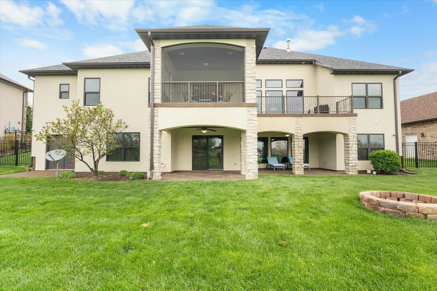 This stunning custom-built home offers elegance, comfort, and breathtaking views, located on the 14th tee of Old Hawthorne golf course. With 5 bedrooms, 3.5 baths, and 4,254 sq. ft., it features 11-ft ceilings, large windows, and a stone gas fireplace. The chef's kitchen opens to a beautiful dining area. The main level includes a primary suite with laundry access, 2 additional bedrooms, 2 full baths, and a powder room. The walkout basement offers a family room, wet bar, 2 bedrooms, full bath, second laundry, and John Deere room. Outside, enjoy covered decks, a fenced yard, fire pit, and optional access to golf, pool, fitness, and clubhouse dining.