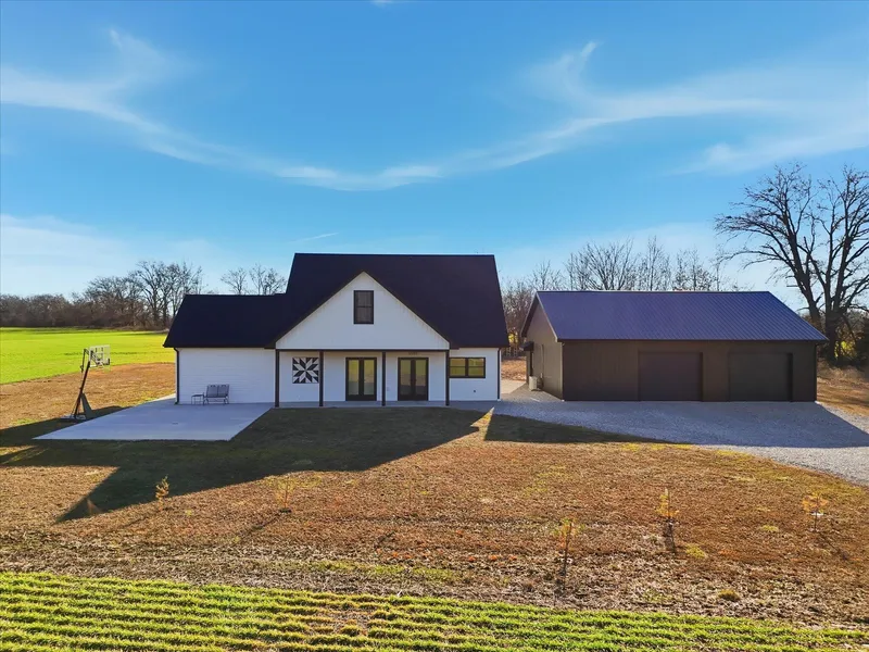Don't miss out on this 2 yr old Stunning 4 Bedroom 2 bath Modern Farmhouse Style home on 21 acres with additional 1200 sq ft climate controlled shop/ 2+car detached garage ( hobbies /vehicles ) in Hallsville School District. Home showcases exceptional craftmanship with an AMAZING open kitchen to eat in area with butcher block countertops ,cabinets up to ceilings, center island and electric fireplace. Main floor master bedroom with and en-suite ( double vanities walk in shower connected to walk in closet and laundry area ). Family room and ½ bath along with safe room ( steel door and concrete ) and all lvp on flooring complete main level. Upper level w/ 3 additional bedrooms ( carpeted flooring ), hall bath with tub /shower combo & additional storage. Hunting, farming or just privacy. PLUS-- Bonus with Additional income potential with crop sharing for 19ish acres. This quiet , private and turn-key creates a modern country living lifestyle at it's finest ! Also --the green walls in the garage are temporary and could be taken down.