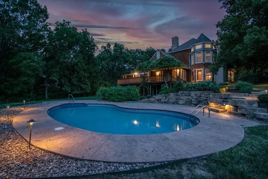 Welcome to a unique manifestation of vision, meticulous planning, and love - a New England Shingle style masterpiece on a private 10.78 -acre lot in Columbia, MO. Built by the current owner, this 6-bedroom, 4.5-bathroom haven is a testament to impeccable craftsmanship and a dedication to creating a warm, inviting home. The property is an oasis of natural beauty, presenting a harmonious blend of wooded areas and open spaces. At the heart of this amazing property, a serene lake offers a peaceful retreat. In addition, a state-of-the-art inground pool, equipped with both chiller, heater & UV filter, caters to year-round recreation and relaxation. Inside, you'll be greeted by rich mahogany-stained custom wood trim, imbuing the home with a warmth and sophistication that carries throughout. A culinary haven awaits in the kitchen, boasting granite countertops, custom solid mahogany-built cabinet...