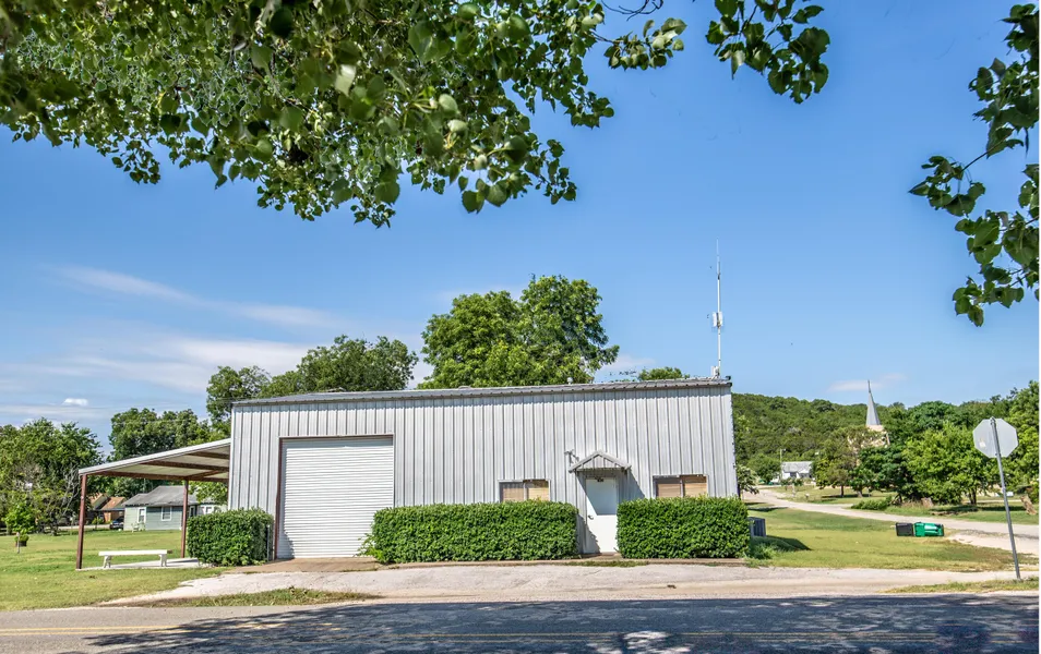 Large building with cute apartment and ample storage located on .033 Acres in downtown Cranfills Gap, Texas across from the Famous Horny Toad Bar & Grill. This metal building is approx. 2900 sq. ft. of storage with a 1200 sq. ft. (+/-) apartment. The apartment is (2) stories with (2) bedrooms upstairs and (1) bedroom located downstairs. There is an efficiency kitchen with breakfast table and large living area. The Southside of the building has a 480 sq. ft. porch with overhang. There are (3) large overhead roll up doors making it great for a shop or storage building. You could easily store your RV, boat and other large equipment items in this building!