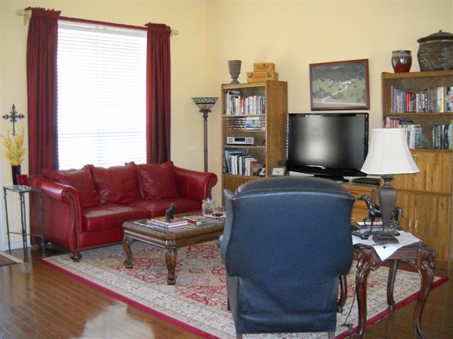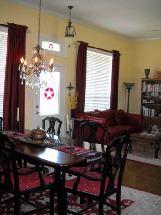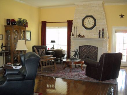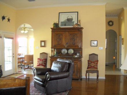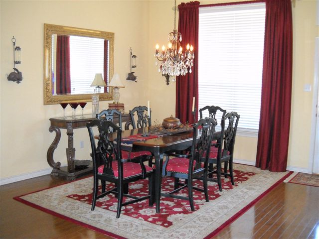 Fancy ranch... combined with the large gathering area, the dining room sits in front of a large window that opens onto the front porch. Beautiful rustic bronze and crystal chandelier, rich draperies and hardwood floors. Just off the gourmet kitchen for those special dinner gatherings.