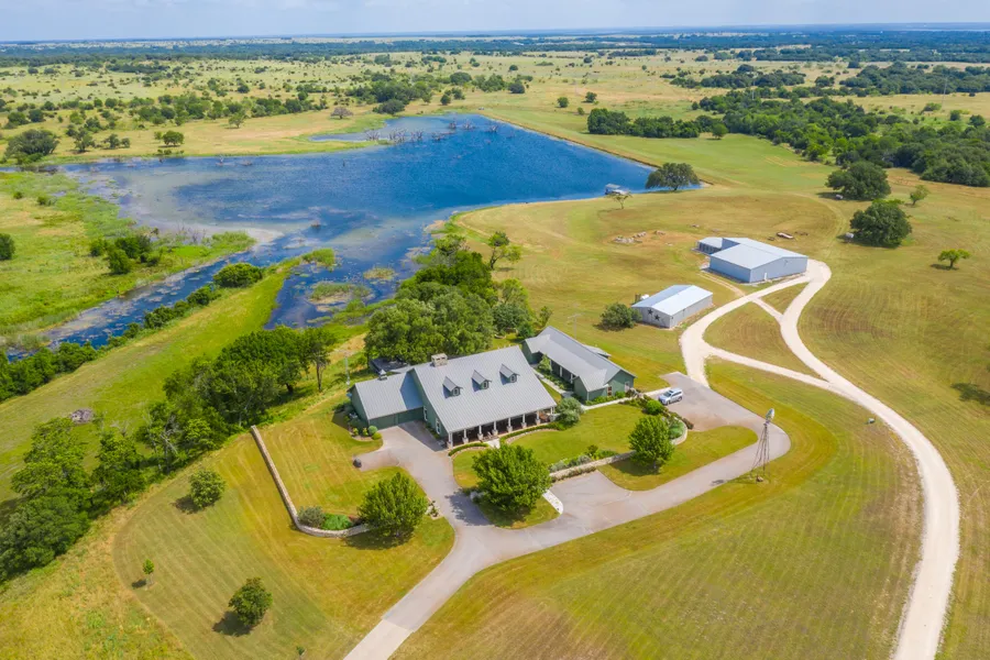The ranch is 1,724 fully fenced and gated acres with a 20-acre lake and 5,639 square feet of living space in the main home and guesthouse. There are two additional outbuildings consisting of an art studio/pottery barn and a large equipment barn complete with air conditioned living space with an office, workout room, generous storage, bathroom, and eight covered outdoor dog kennels.