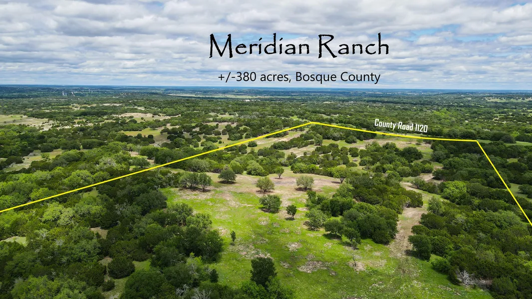 The 380 acre MERIDIAN RANCH in BOSQUE COUNTY is rightfully called "TOP OF THE HILL COUNTRY". With elevations ranging from 840 to 960 ft. the multiple hilltops offer amazing panoramic views. The ranch is full of FEATURES- meandering limestone rock CREEK BEDS, miles of winding ROADS and TRAILS, huge LIVE OAKS, multiple PONDS, small open pasture areas, tons of WILDLIFE, drilled WATER WELL, and several dramatic HILLTOP locations to build. Just a few minutes from downtown MERIDIAN, 45 minutes from Fort Worth, 1.5 hours from Dallas, 1 hour from WACO, and 2 hours from AUSTIN, MERIDIAN RANCH is a convenient escape to the quiet of country living. Nearby attractions include LAKE WHITNEY, shops and dining in the charming DOWNTOWN, Kimball Bend PARK, Meridian STATE PARK, Bosque Valley GOLF CLUB and the Vineyard WINERY. MERIDIAN RANCH is the retreat you've been searching for!