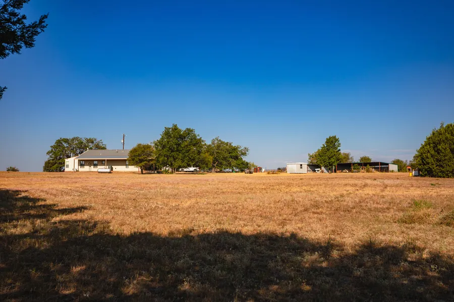 Large barn with shop and equipment bays. Land is gently rolling, with views to the south and southwest. Nice pond that still has water. The property is fenced and cross-fenced for goats, sheep, or other livestock. Water is supplied by private well. The original farmhouse surrounded by trees remains on the property. Gated entrance on paved county road with nice neighbors.