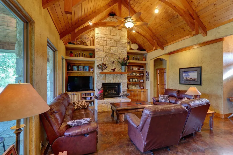 Rustic, ultra modern home offers lots of woodwork and plenty of custom features. Home highlights include knotty alder doors, oil rubbed bronze fixtures, kitchen aid appliances, central vac, and a master suite to die for. Tons of storage and many built-ins. The cabana area has a fireplace, sink, grill, and TV overlooking the pool. Has a great shop with tons of additional storage and covered parking spaces for a boat and an ATV. Private entry gate at the road and is set up for a horse or two. Sits on 5.89 acres with half ownership of 3 acres that features a private lake stocked with large fish. Broker/Owner