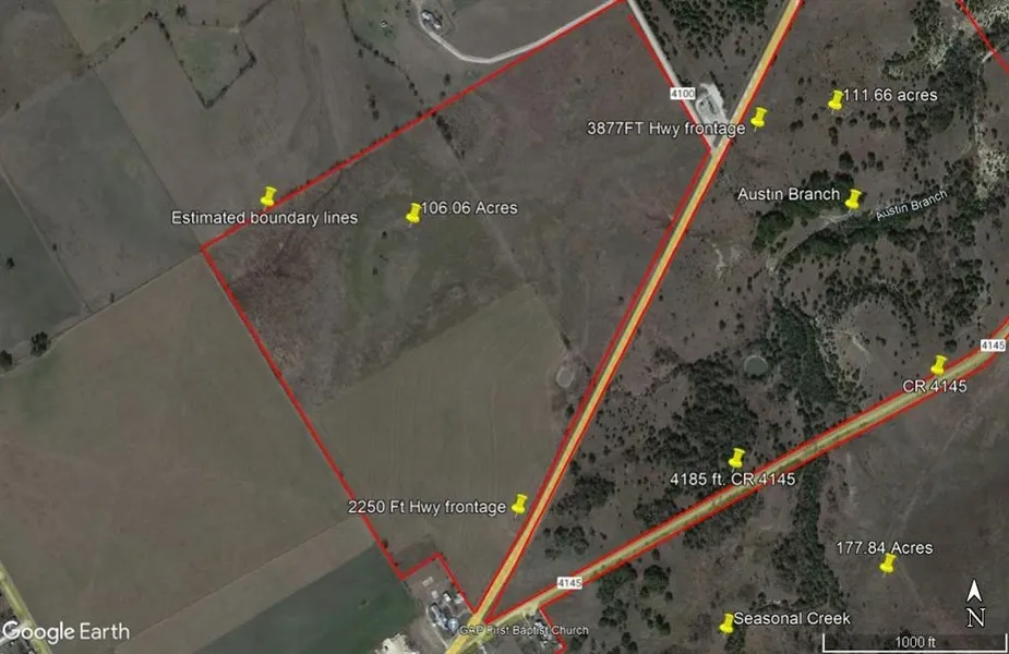 This is part of the old Hansen Ranch just outside Cranfills Gap, better know as the Gap. This 106 acre piece offers about a 35 acre coastal field with the rest being open pasture. It is completely fenced and cross fenced with a small pond that holds water except in a drought like we have now. There is about 2250 ft of Hwy 22 frontage and 956 ft. of county rd 4100 frontage on the west side.