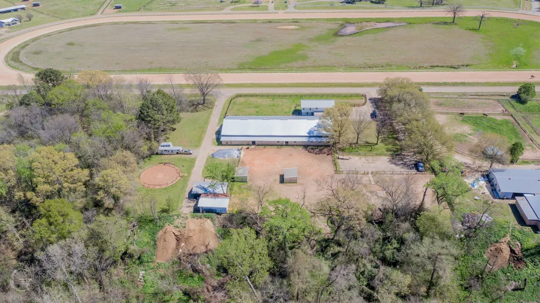 Welcome to Hurricane Bluff, a unique equestrian property located in the rural landscape of Benton, Louisiana. This established training center offers a rare opportunity for horse enthusiasts, trainers, and investors alike, with access to a community racehorse training track and exceptional on-site amenities. The heart of the property is a 160’ x 75’ barn, outfitted for serious equestrian use. It features 32 stalls, two tack rooms, two feed rooms, two wash rack bays, and a recently added 5-horse hot walker. The barn’s roof is just five years old, and it includes a fully equipped bathroom with showers, laundry center, and a one-room efficiency apartment, offering flexible on-site housing options. Adjacent to the barn is a paddock with two covered areas for turnout, plus a carport suitable for two large tractors or farm equipment. Two residential dwellings are included. The main home is designed for versatility and can function as one or two separate units. It offers 3 bedrooms, 2 full baths, an office space, open-concept kitchen with full-service cocktail bar and counter seating, and a large utility room—perfect for full-size laundry units and even pet kennels. While the bathrooms retain their original charm, the layout is ideal for modern updates. The upstairs living room opens to a deck that overlooks the horse track and surrounding training center, with views stretching toward the Red River which backs the property. Both an interior spiral staircase and exterior metal staircase provide access between levels. Whether you are expanding your equine operations or seeking a property with room to grow, Hurricane Bluff blends functionality, scenic surroundings, and a true equestrian lifestyle—all within a peaceful rural setting.
