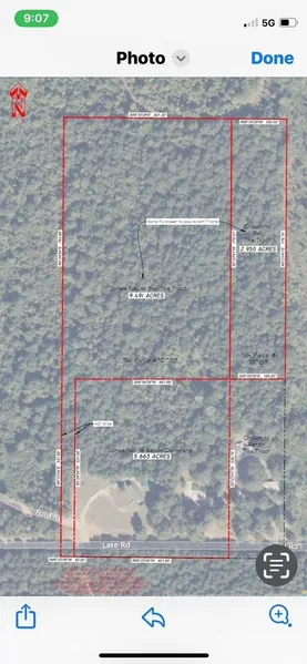 Almost 9.5 acres. There will be a 40' access point to get to the property. See plot attached. Halfway between the plain dealing fishing lake and skying lake. This property is heavily wooded.