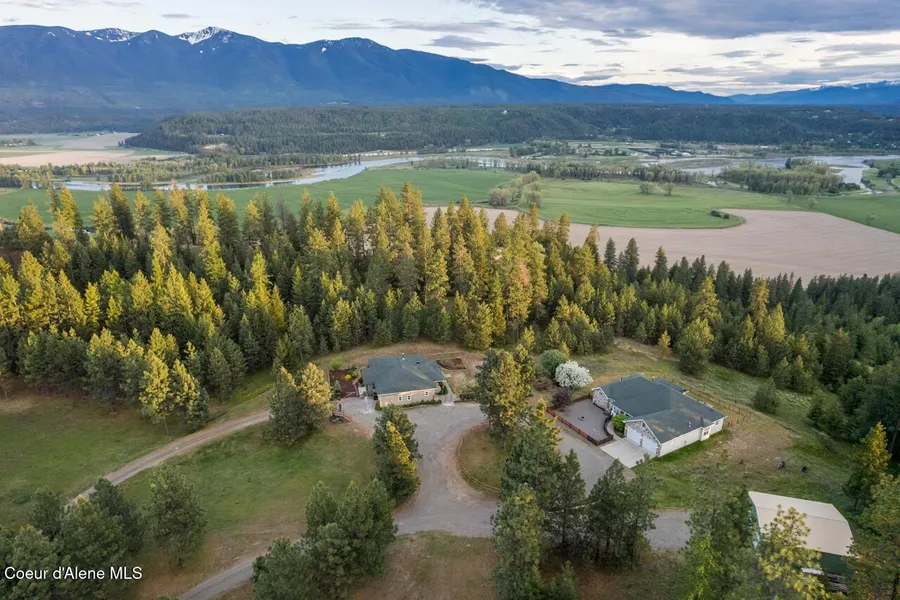 Two Homes in a prime location with spectacular views of the Selkirk and Cabinet Mountains, Bonners Ferry and the Kootenai River! Watch holiday fireworks from your backyard!! Find privacy and tranquility at this 5.09 acre at the end of a cul-de-sac in the North Bench. 2520 sq ft main home features 3 bed and 2 baths, office/den with french doors, formal dining, spacious kitchen with island and breakfast nook and 9 ft ceilings throughout. Great room has a gas raised hearth rock fireplace, and sunroom overlooking the mountain views. Laundry room with storage and utility sink. Master bedroom includes a large closet, en suite bath, shower and freestanding tub with stunning views. Central vac and all appliances are included. 1670 sq ft second home has 2 beds, 2 baths, office, dining room, living room, and family room with a pellet stove open to a beautiful kitchen leading to laundry/mud room. Both homes are landscaped, fenced and have a garden area with trees and flowers. The level property . The level property also includes a 34x40 foam insulated shop, with RV door. Don't miss this one!