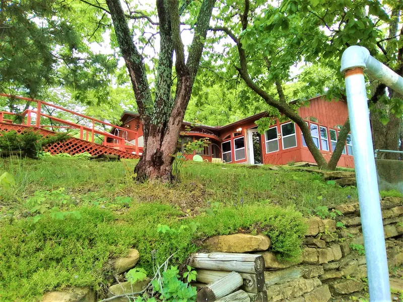 Energy efficient, east facing, earth-contact home with lake frontage and dock on cove. Large LR could be divided for additonal BR. Back-up propane heaters with owned propane tank. Total electric home. Some furniture will remain. Stunning views from sun room; great gaming and outdoor eating area with multiple cabinets and storage. Property has holding tank. Shared storage/boat docking area along north property line. Assoc. membership allows owner use of Sugar Valley amenities at Mound City, including golf course, club house & pool. 2 car det. garage/shop has a finished room with heat/air. Could be used for guest area. No plumbing currently in garage.