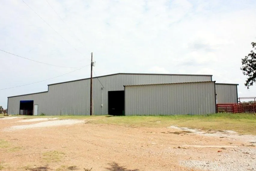 22 stall new metal horse barn with attached covered arena approximately 125' x 175' and attached sheds.