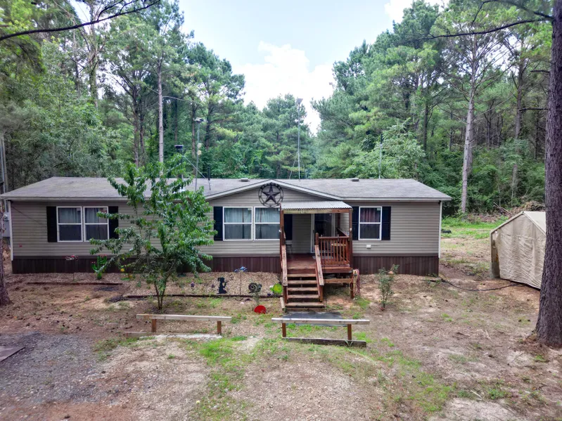 This 2018 model 3-bedroom, 2-bathroom manufactured home rests serenely on 8 acres, providing a secluded retreat equipped with contemporary comforts. Enjoy reliable Starlink internet, updated fixtures, and a cozy wood-burning stove with a fan for optimal warmth. You will find vaulted ceilings throughout the living area, kitchen and master bedroom giving this home a very open feel. Notably, the property boasts a private well, ensuring no water bills, while its well enclosure minimizes maintenance and prevents freezing. Step outside onto two outdoor sitting areasa spacious 8'X8 covered front porch and an expansive 10'X36 rear deckperfect for soaking in the tranquil surroundings and observing wildlife drawn to the game feeder. Deer and occasional wild turkeys are frequent visitors. Access is via a gated entrance and a 300 rock driveway connecting directly to the FM road, ensuring year-round accessibility. Additionally, a12X24 shop with a concrete slab, electricity, and a roll-up door offers secure storage for your belongings, shielded from the elements. Also included is a 8x40 hi cube container that has electric installed for extra storage or finish out for extra living space. The property, predominantly adorned with pine timber, provides ample shade even during the hottest summer days. Among its natural features are pear, peach, and fig trees thoughtfully planted to enhance the landscape.
