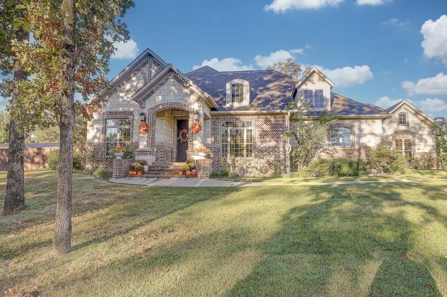 This elegant Country French Chateau features four bedrooms, three full baths, and a half bath for easy pool access. The backyard oasis includes a gunite walk-in pool, hot tub, water feature, and a covered patio with a fireplace, TV, and outdoor kitchen. Inside, hardwood floors grace the main areas, while the open-concept family room boasts a gas log fireplace, vaulted wood-clad ceiling, and exposed beams. The gourmet kitchen offers a massive island, granite counters, a brick backsplash, high-end appliances, and ample storage. The primary suite includes a luxurious bath with a walk-in wet room, dual vanities, and a spacious closet. Additional features include a large utility room, tankless water heater, and attic storage above the three-car garage with a lift. A detached 30' x 75' insulated shop offers a play space, wet bar, mini-split, and 220-amp service, plus a covered camper space with a 30-amp plug. A storm cellar accommodates six, and the privacy-fenced yard includes a separate dog run.