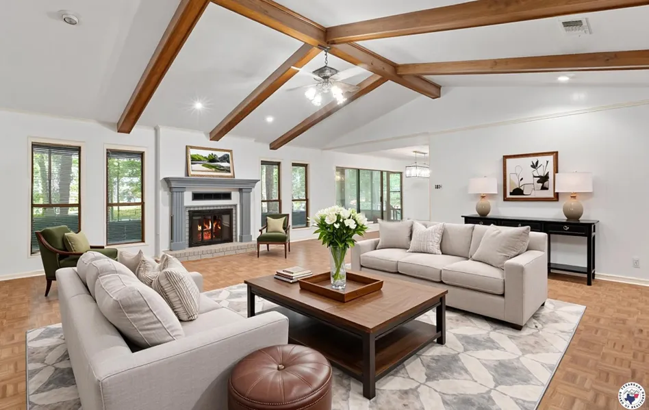 This stunning contemporary home is thoughtfully designed for effortless entertaining, offering a spacious open layout, a large kitchen, vaulted ceilings, and a charming wood-burning fireplace. The property backs onto a serene stand of trees, where you can often catch glimpses of wildlife from the comfort of your enclosed back porch. This versatile space also serves as a third living area. Situated in the heart of Pleasant Grove, the neighborhood exudes charm and provides an ideal setting for jogging or leisurely walks through its tranquil, park-like surroundings. The home has recently undergone significant upgrades, including sleek new quartz countertops, brand-new appliances. Designer lighting enhances the space, creating a warm and inviting atmosphere, while the preserved original parquet flooring adds character to the contemporary design. The primary bedroom is a true retreat, featuring a freestanding soaking tub, elegant sconces framing the quartz vanity, and a cozy vanity area. The family room is ideal for entertaining, complete with a wet bar, while the enclosed back patio offers a perfect space to unwind in privacy. There is an additional Room for Living/or office space and could easily convert to a 4th Bedroom. Practicality meets convenience with a large laundry room equipped with a washer and dryer, alongside a half-bath for added functionality. This is in addition to the two full bathrooms between 2 Bedrooms. This home has no carpet for ease of interior maintenance & a well & sprinkler system for exterior upkeep.