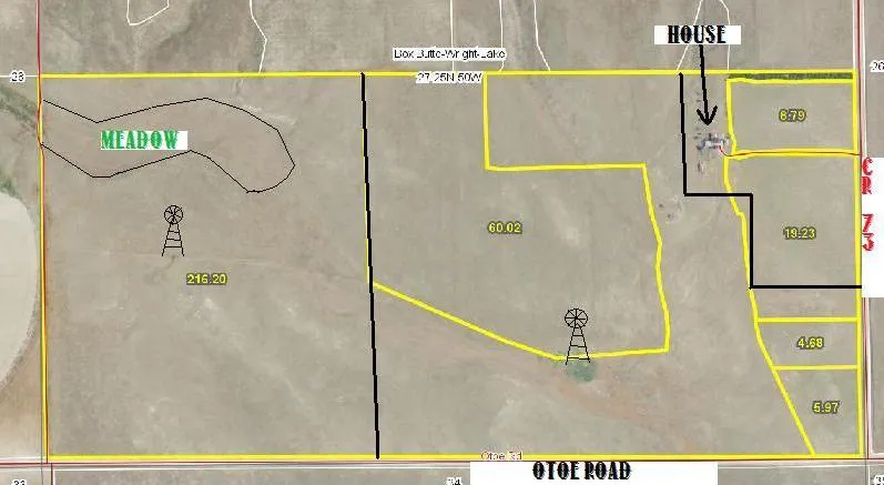 This Half Section of Land has very good access with an oil road most of the way to the property. The majority of the acres lay in the Draw of Barrel Springs Creek, which allows the pasture land to catch most run off from surrounding fields and provides good moisture for grass growth. The property has been recently fenced and cross fenced for sufficient rotation of animals. There are two windmills with newer 8 Aermotor heads. Also included is an older 4 bedroom home with well and two outbuildings. The property is owner rated 60-70 head of cows for 5 months, or; produced 60-70 bales from the meadow and dry land farm ground on good years, plus pasturing.
