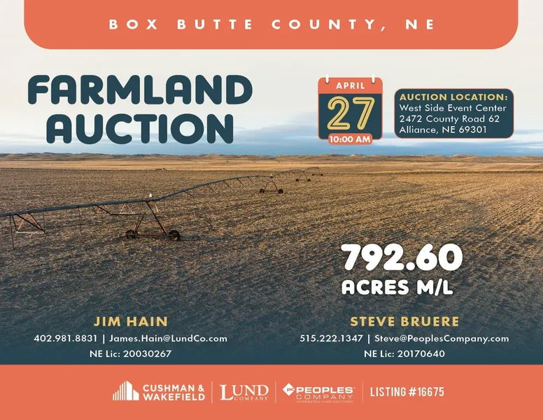 Box Butte County, Nebraska Farmland Auction – Mark your calendar for April 27th, 2023! Peoples Company and The Lund Company are proud to be representing the sale of 792.60 acres m/l near Alliance, Nebraska. Situated in the Upper Niobrara White Natural Resource District (NRD), this farm contains approximately 675 acres that are irrigated through five well-maintained pivots. Currently, the property has a total allocation of 419.6 inches every 5 years or approximately 83.92 inches per year. A diverse set of crops have been grown including potatoes, sugar beets, corn, winter wheat, and oats. This farm would make a great add-on to an existing farm operation or an excellent investment opportunity. The property will be accessed via an easement off of Thomas Road. The farm is located in Section 29 & 30 of Box Butte-Wright-Lake Township, with quick access to multiple grain marketing options along...