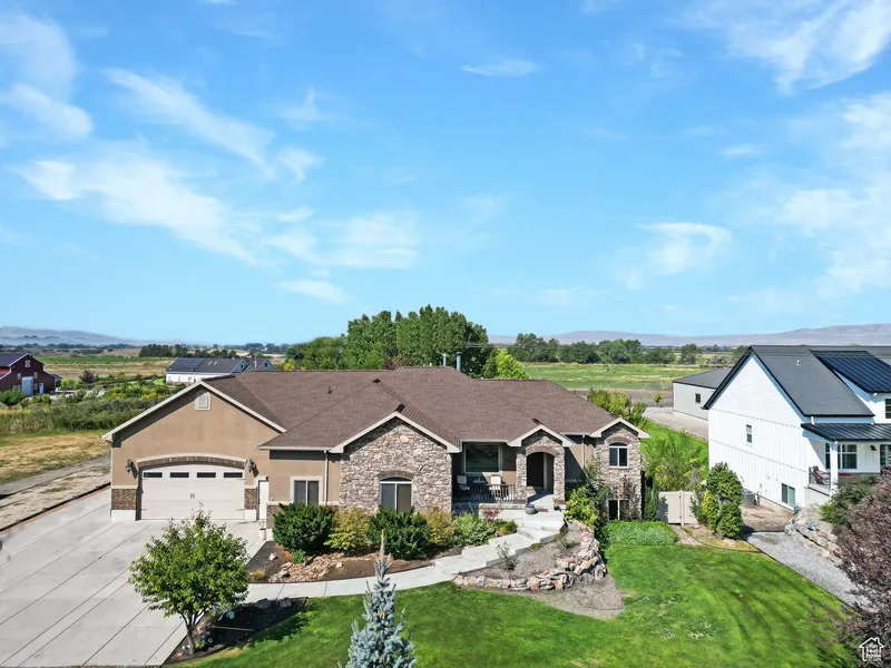Welcome to this stunning country home in Deweyville, capturing sunset views over the Coldwater Mountain Range. The open-concept layout boasts a sunlit kitchen, great room, and a master suite with a walkout sunroom featuring a see-through gas fireplace, jetted tub, and double walk-in shower. The lower level offers additional living with a kitchenette and beauty salon, along with laundry on both levels. A mudroom with custom cabinets and lockers adds convenience, while landscaped grounds showcase a waterfall, mature trees, and a spacious garage with RV parking plus an outbuilding for ample storage. Available to pre-qualified buyers only. Square footage figures are from county records; buyer to verify.