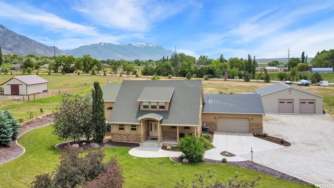 As you enter, this GORGEOUS 6 BEDROOM HOME OVER 6000 SGFT, on 5 BEAUTIFUL ACRES!!! Home sits on 1 acre with 4-one acre paddocks with electric fence that can be arranged however you would like. WATERPROOF LVP THOUGHOUT, UPGRADED KITCHEN with STAINLESS STEEL appliances,GRANITE counter tops, radiant heat WITH3 ZONES, possible butler's pantry or craft room off kitchen. HUGE Master bedroom with lovely covered porch overlooking beautiful mountain views. Master bath has an amazing, custom, walk-in closet. There is a fully finished walkout basement with 9ft ceilings has a LARGE FAMILY ROOM with cozy GAS FIREPLACE and an extremely SPACIOUS BEDROOM, LARGE FULL BATH second room is being used as a bedroom, but would be a great theater room and a WALKOUT TO GREAT COVERED PATIO WITH HOT TUB. Attached 2 car garage is gas heated with thermostat. NEW WATER SOFTENER, INSTANTANEOUS HOT WATER, SUMP. Small garage has 220v and could be used for lawn equipment or more toys. Large 4 car garage has extra lighting and electrical. Yard is on a 22 zone sprinkler system, home(1 acre) is on culinary water, 4 acres is is on irrigation. Fruit trees(peach, plum, apricot, almond) and herb garden. OVER 1800 SQFT DETACHED GARAGE-ROOM FOR EVERYTHING!!! This listing is also on the MLS has a residential listing, MLS # 1893668. You can look at that listing for more detailed information. HOA Remarks: HOA controls secondary water system, irrigation with Bear Rive Canal Water. . Usually includes some liability insurance and reserves. Changes Annually. Acreage cannot be split or portioned out. HOA Fees $368 annually.