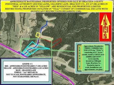 BRACKEN CO. GILLESPIE LANE - Three Commercial Lots located just off the "AA" Hwy (KY 9) on the Gillespie Lane! 3.7157 Acres Available for $125,000!!! Or take your choice of 5.8519 Acres or 6.9197 Acres for $185,000!!! Lots on county road JUST OFF KY 9, THE "AA" HWY!!! Public water and electricity available! CALL TODAY!