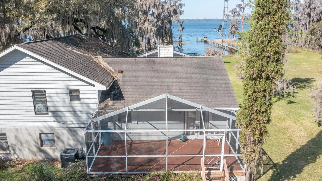 What an amazing home on a large treed private lot with over 100 ft. on beautiful Lake Santa Fe. The home boasts 2 living areas with 3 spacious bedrooms and screened outdoor areas on all three levels. A separate building offers a large game room area with huge bar area and along side a single car/boat garage that has doors on both sides of the building. You can launch your boat directly from your property!