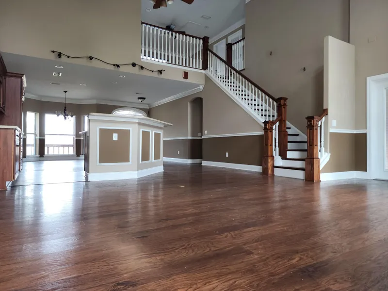 Walking through the front door will leave you in awe. The great room features an open layout that connects to the loft area and a beautiful staircase leading to the second floor. The kitchen and dining room are also open, offering a view into the great room. Adjacent to the great room is the living room, which provides additional space for computers, toys, or arts and crafts. Overall, the kitchen, dining area, and great room are spacious, with a bar area in the kitchen that allows for plenty of room for family activities. The separate living room next to the great room and kitchen adds even more space for your needs.