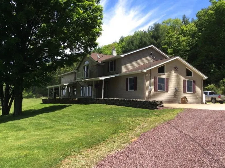 876 farmhouse in Bradford County, PA remodeled & restored to produce a very livable & open floor plan to enjoy the best of country living. Oak hardwood floors & trim add warmth to this 4,329 SF home of well appointed living space. 25x30 GREAT room showcases impressive display of wild animals, birds, mountain sheep & turkeys of big game hunter/owner. Endless views from this beautiful 4 bedroom home on 55+ acres. 40x60 heated pole barn. Very private setting on knoll w/ pond nearby. This one of a kind home offers a gorgeous great room w/ stone FP, radiant heat & loft. Quality materials & workmanship make this country homes especially livable. Rec room offers private office, built in sauna, hot tub, TV & exercise area. Kitchen w/ granite counter tops & lots of cabinets + a breakfast nook. Acreage mostly wooded providing good hunting. PA area well known for its fine white tail deer & wild tur...