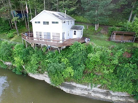 PANORAMIC RIVER VIEWS will be found here at this Getaway along the beautiful Susquehanna River.Hardwood floors throughout the great room that will be the center of your entertaining, kitchen w granite &chopping block countertops, opens to the dining rm & living rm + numerous sliding glass doors to enjoy the sounds of the river which leads you to the wraparound deck. The master w the best views & 2 addl' bdrms & full bath + w/d all on 2nd flr,100% OGM rights convey. Grab your fishing poles and kayaks- It is time to enjoy all 4 Seasons in the Woods & watch the Sunrise along the Riverfront!
