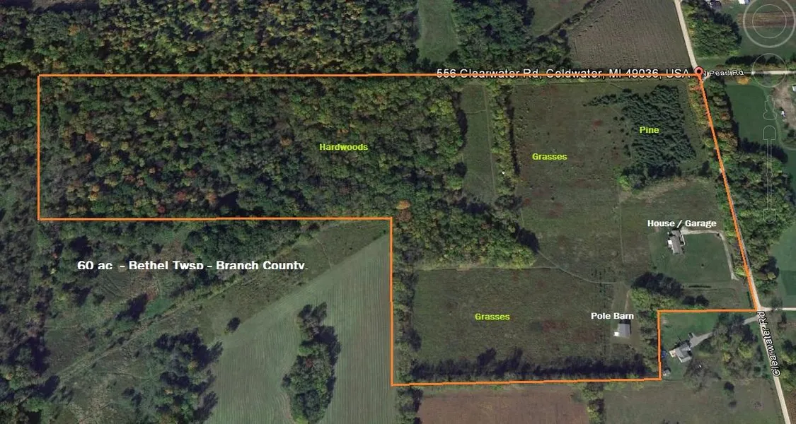 This property has it all. Hardwoods, Pine, bedding grasses, Food source areas, and all surrounded by AG fields in a great area of southern Branch County where many big bucks are shot each year.
