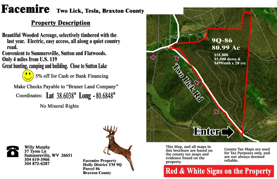 FOR SALE: 80 acres located up Two Lick road near Tesla, Braxton Co, WV. This property would make a nice place for hunting, camping or recreational. Easy access off a one lane hardtop road. Also within 15 min. from public hunting land, trout stream and Sutton Lake.