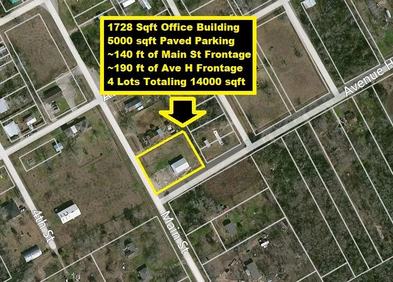 New Price! Residential or Commercial corner property with a 1728 sqft building, 5000 sqft parking lot, ~140 ft Main St Frontage, ~190 ft Ave H Frontage & 7000 sqft cleared side yard to expand or to build a home next door. Building has 3 offices, break room, conference room & large multipurpose room with a commercial sink! Work & live in a wonderful small town close to Houston. Great for a store, hair/nail salon, clinic, laboratory, day care, church, real estate office, insurance or law office! Numerous possibilities! Has Lockbox! Call CSS for Showing Instructions 713-977-7469!
