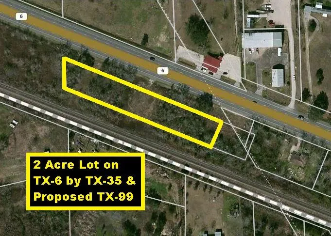 2 Acre Lot w/~590 ft State Highway Frontage on TX-6 by TX-35 & Proposed TX-99. When Completed Houston's 3rd Loop (TX-99) will be longest beltway in the US connecting Katy to the Woodlands, Baytown & League City. Minutes to Alvin Schools, Community College, Parks & Fire/Police Depts. 20 miles to Hobby Airport, College of the Mainland, Pearland Town Center & Texas City Refineries via TX-288, TX-35 & I-45. Outside Alvin City Limits! No Back Neighbors! 30 miles to TAMU/Galveston & the Gulf Beaches.