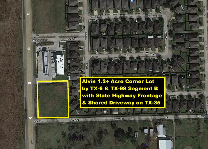 Alvin 1.2+ Acre Corner Lot with State Highway 35 Frontage located in Alvin City Limits with All City Utilities & Off Site Detention in Place! Shared Access Drive From SH 35! Corner Lot has 541 feet State Highway 35 Frontage & 211 feet Barrell Road Frontage. Property Fronts North Pointe Trails w/238 Homes and is Across SH 35 From Kendall Lakes With 530 Homes at Completion. Demographics Report Estimates 2018 Population of 38,411 in the 3 Mile Radius. Growth Between '18 & '23 is Projected at 14.53%. Average HHold Income is $98,836. TxDot Traffic Counts for 2019 Show an Average of 23,484 Cars Per Day Passing on SH 35. Lot is 3.5 Miles N of Hwy 6, 3 Miles N of FM 517 (Grand Pkwy Seg B see Map), 1.5 Miles N of FM 528, 7.5 Miles S of FM 518 and 10 Miles S of Beltway 8. Not included in the price, but also available for sale is a 2.6+ Acre Lot on the NE Corner of 35 & N. Pointe Trails Dr. Seller ...