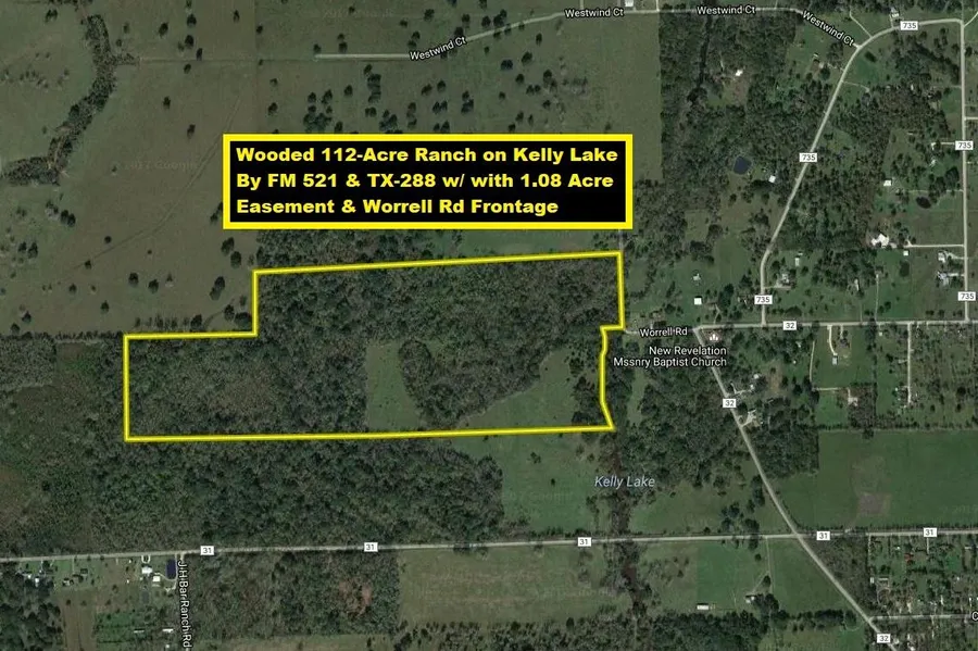 Priced Under $500K! Ag Exempt! Wooded 112-Acre Cattle/Hunting/Fishing Ranch NW of Angleton w/Styles Bayou Frontage By CR 32 & CR 31 Minutes to FM 521 & TX-288. Property has 1.08 Acre Easement w/509.53 ft Road Frontage on Worrell Road! Partially Fenced, Mostly Wooded with Some Pastures & Styles Bayou (also known as Kelly Lake) runs South through Eastern Portion of Property. Located Outside Any City Limits! Minutes to Angleton, TX-288, UTMB Medical Center & TX Gulf Coast Regional Airport. 25 Miles to Proposed TX-99, Pearland Town Center, Freeport/Chemical Plants & Gulf Coast Marinas/Beaches. 40 Miles to TX Medical Center & Houston. Perfect Location w/Great Potential. Hunting, Residential, Farm & Ranch OK. Needs Well & Septic. Low Taxes! Appointment Required to Walk Property Due To Cattle! Disclosures Available!