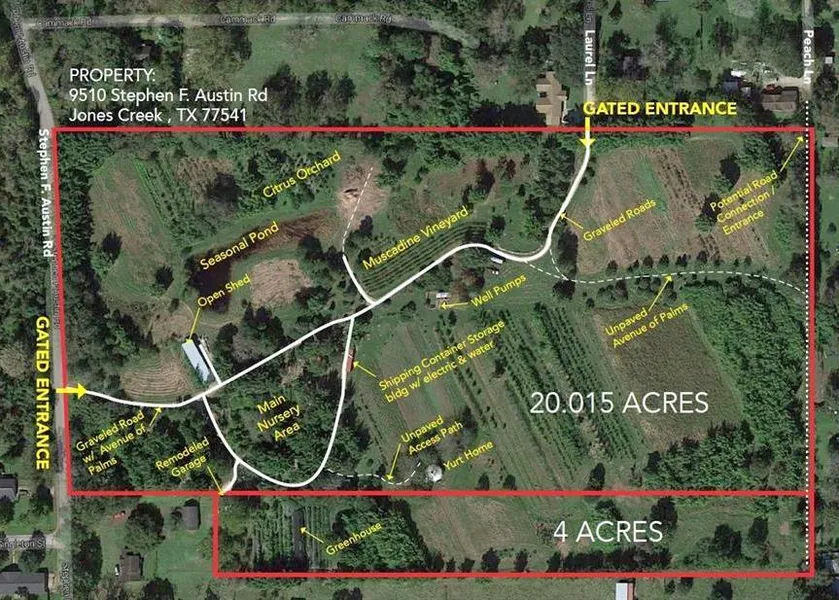 Per Seller: Property Never Flooded. Jones Creek 24-Acre Irrigated Organic Farm & Vineyard with Yurt Style Living Quarters & ~654 ft Stephen F Austin Road Frontage. 750 Sqft Yurt is on stilts w/central air & heat, tankless water heater & septic system. Nursery has provided organic produce to Houston & Austin Restaurants since 2005. Property has rich soil for growing vineyards, tropical plants & citrus trees. 2 Wells supply water for irrigation system throughout the 24 acres. Property is 2 tracts being sold together: 20-Acre Tract is 1356 ft x 805 ft & adjacent 4-Acre Tract is 1088 ft x 162 ft. Landscape has continuous flow between both tracts. This is an active business with farm hands living/working on property. Property has 2000 Sqft greenhouse, newly rebuilt 2-car garage & 1600 sqft (90x17) Carport. Well constructed gravel roads connect 2 of the 3 street frontages making this property ...