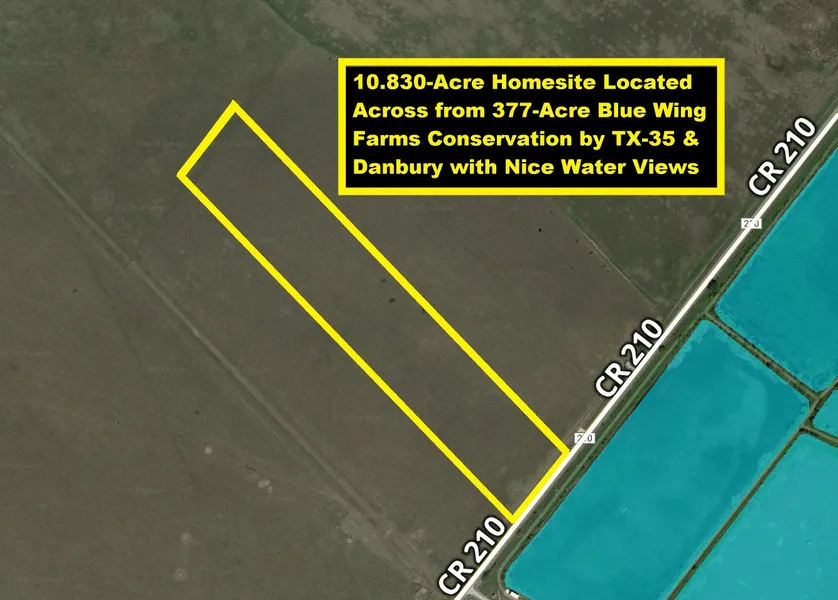 Ag Exempt! Nice 10.830-Acre Homesite by TX-35 & Danbury with beautiful views of numerous bald eagles, waterfowl & shorebirds that visit the 377-Acre Blue Wing Farms Conservation's constructed wetland units & large wading bird rookery located across the road (see pics of water views). Property has 280 ft County Road 210 Frontage, is partially fenced & needs well & septic system installed. Horses, Cattle & Poultry Allowed. See Survey & Restrictions under Docs. Property is located SE of Danbury & TX-35 just minutes to TX-288, Angleton, Alvin, Brazoria National Wildlife Refuge, Bay Fishing & INEOS Chemical Plant. 30 Miles to Hobby Airport, Freeport Plants, Lake Jackson, Gulf Beaches & Brazos Bend State Park. Very Low Taxes! No HOA! Needs Culvert & Driveway!