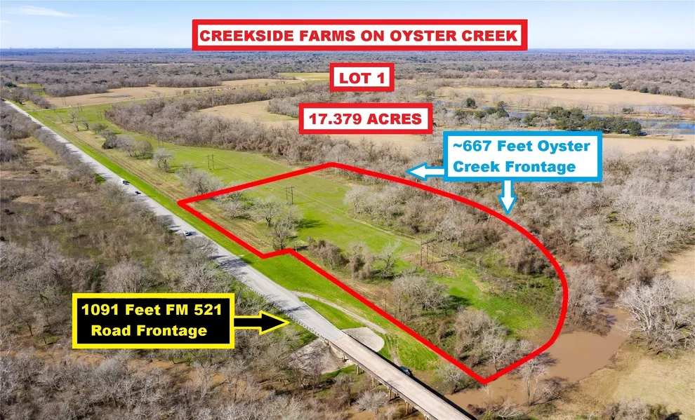 Seller Financing Available! Ag Exempt! Creekside Farms On Oyster Creek Waterfront 17.379-Acre Lot With 1091 Feet FM 521 Road Frontage & ~667 Feet Creek Frontage. Located South Of FM 523 Near Hwy 288, Hwy 35 & Angleton Schools. 10-15 Minutes From Walmart, Kroger, Specs & Downtown Angleton, Yet In The Quiet Country With Room To Stretch Out. The Lot Lies West Of Angleton, North of Baileys Prairie & South Of Holiday Lakes (see Map). Property Is Located Outside Any City Limits Or ETJ; But, There Are Some Restrictions. Survey & Restrictions In Docs. Just 5 Minutes West Of Hwy 288 & 5 Minutes North Of Hwy 35 Provides Easy Access South To Freeport Plants/Surfside Beach ~20 Miles Away And North To Downtown Houston/Hobby Airport ~40 Miles Away. No Water Or Sewer So Buyer Needs To Install Well & Septic. Seller Retains All Owned Minerals. Only A Few Lots Left; Each With Road & Creek Frontage. See Pi...