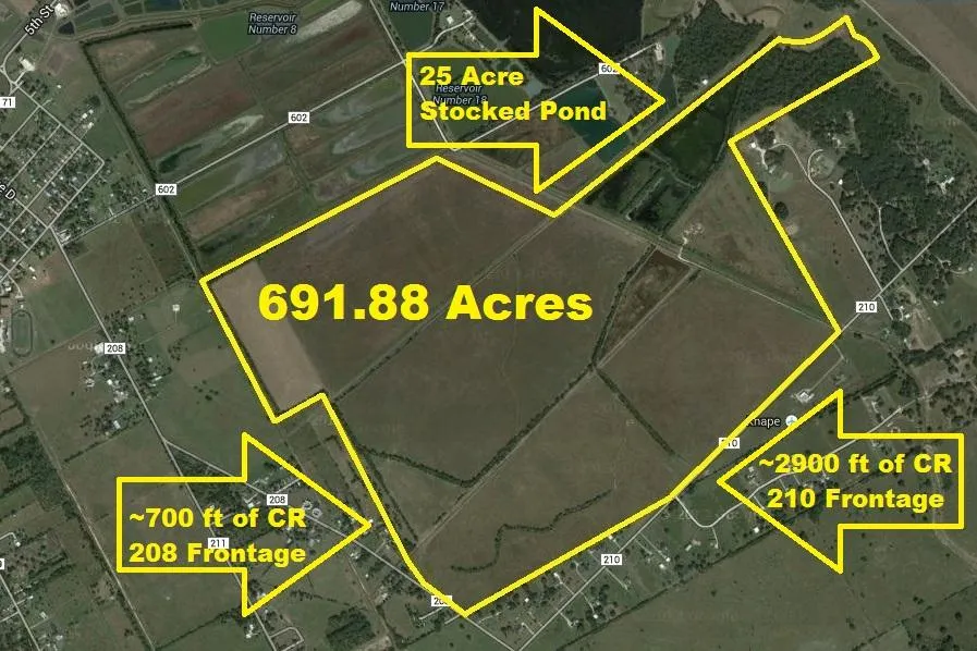 ~692 Acres of Prime Farmland with 25 Acre Stocked Lake, ~2900 ft of CR 210 Frontage & ~700 ft of CR 208 Frontage Near Danbury. Previously farmed for Millow's corn, rice & hay. Irrigation canals & roads run through the fenced property. Great for investor as property is currently leased with cattle and horses. Entrance to property is from CR 210. Listing Agent must Accompany Due to Cattle & Horses on Property! Make Your Appointment Today! Owner financing will be considered!